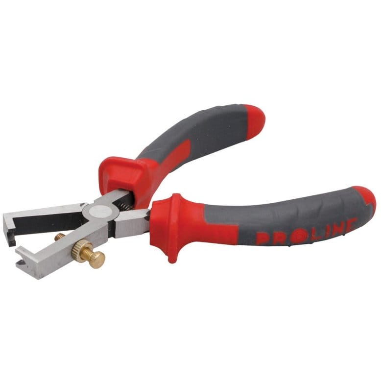 Patent dezizolator Proline 28486, cu maner din cauciuc, ideal pentru indepartarea izolației cablurilor de la 0.5mm la 5.0mm. Design ergonomic pentru utilizare confortabilă.