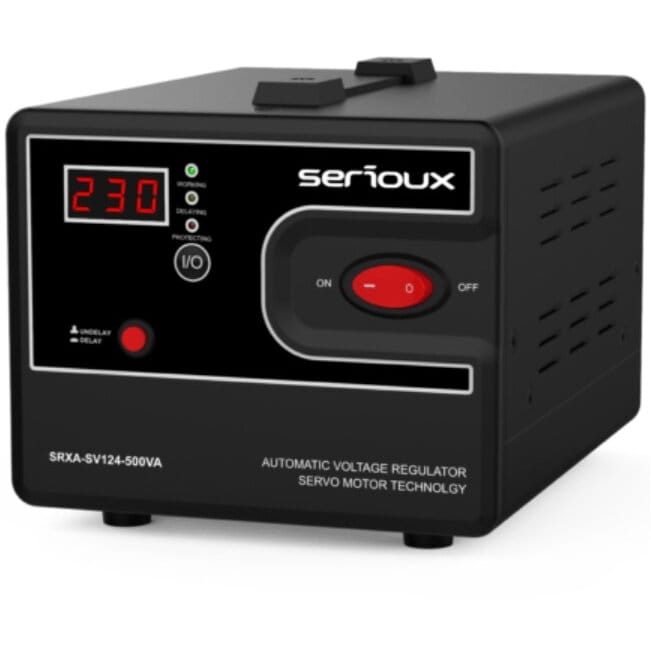 Stabilizatorul de tensiune Serioux 500VA 300W, protecție la supratensiune, scurtcircuit și suprasarcină, reglare automată a tensiunii pentru echipamente sensibile. Ideal pentru birouri și uz casnic.