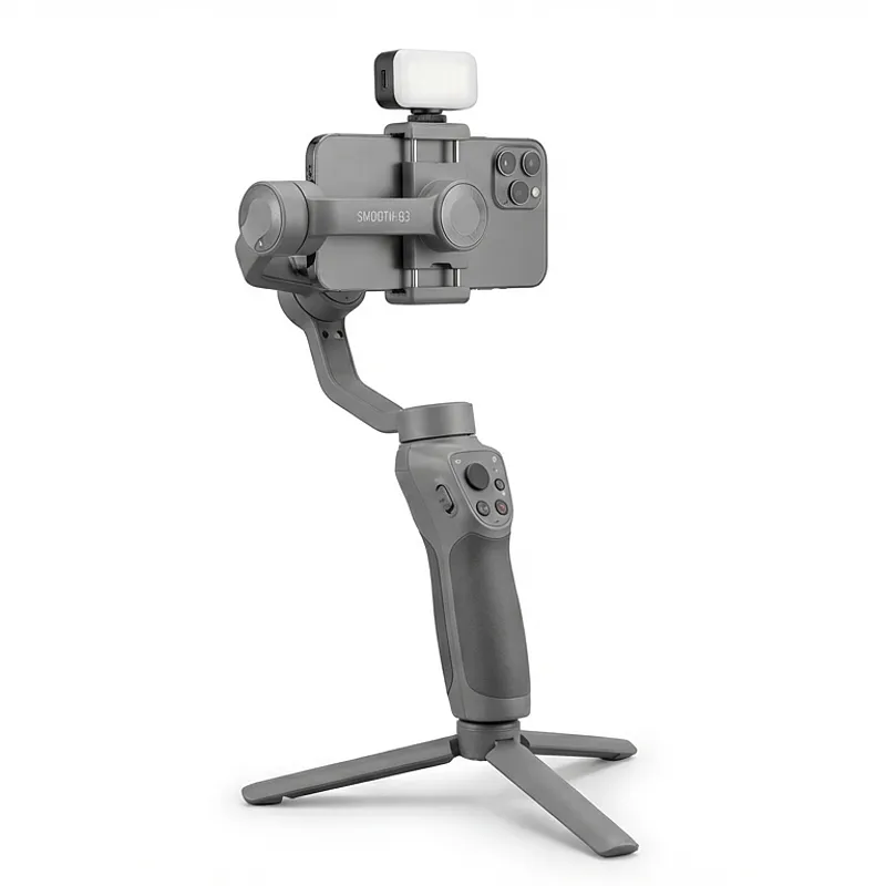 Stabilizator Gimbal Smooth-Q3 Combo cu iluminare LED, rotație 180°, autonomie 7-14h. Filmări profesionale stabilizate perfect pentru smartphone.