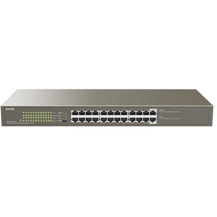 Switch 24 Porturi TENDA TEG1124P PoE Gigabit, 250W, protecție completă, funcții VLAN și Extend pentru camere IP, rețele birouri și aplicații comerciale.